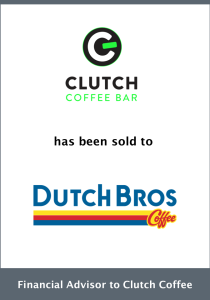 Armory Securities, LLC is pleased to announce the successful closing of the acquisition of Clutch Coffee Bar (“Clutch Coffee”) by Dutch Bros Inc. (NYSE: BROS). Clutch Coffee is a regional drive-thru coffee platform operating 20 locations across North Carolina and South Carolina. The transaction closed in January 2026. Armory served as the exclusive financial advisor to Clutch Coffee in connection with the transaction.